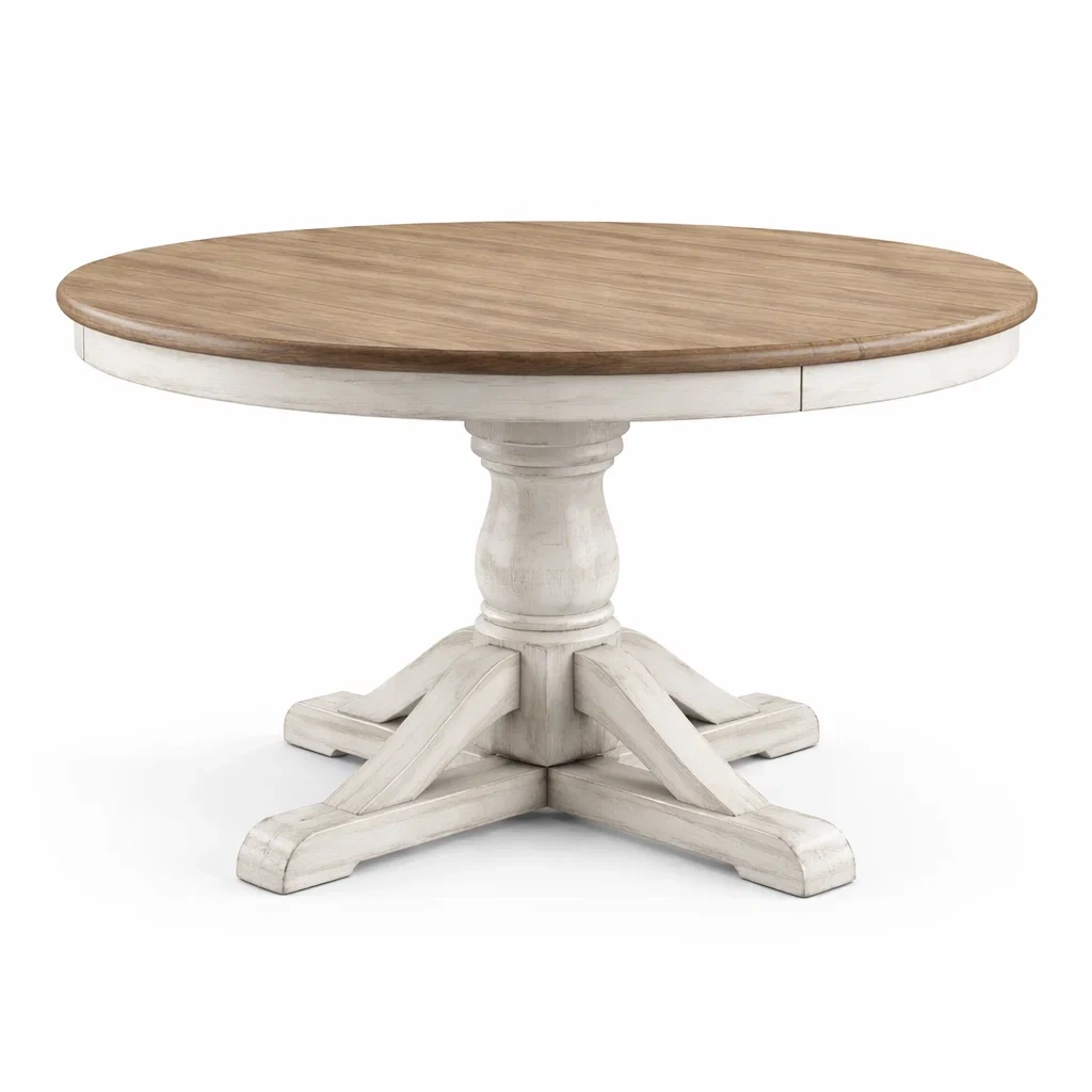 Table ronde avec un plateau en bois de chêne massif et des pieds en bois massif blanc.
